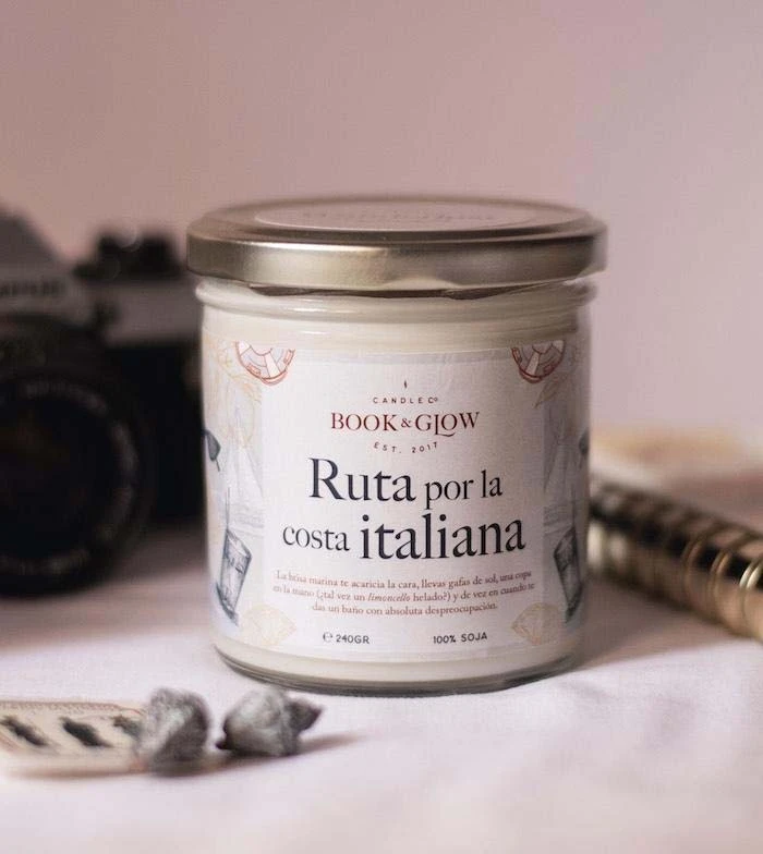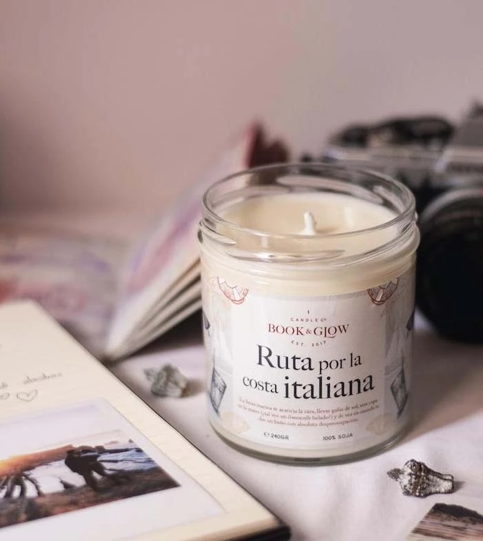 Bougie de soja de la collection Book and Glow Wanderlust. Route le long de la côte italienne.