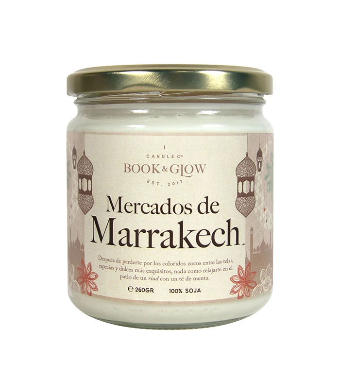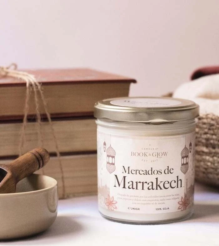 Bougie de soja de la collection Book and Glow Wanderlust. Marchés de Marrakech.