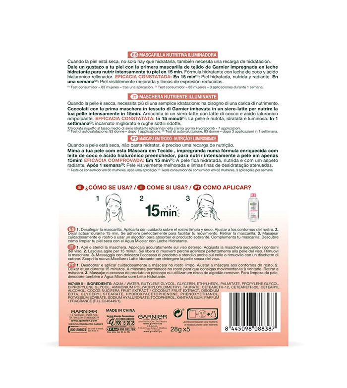 Pack de 5 masques en tissu Nutri Bomb au lait de coco et acide hyaluronique, idéal pour les peaux sèches et ternes.