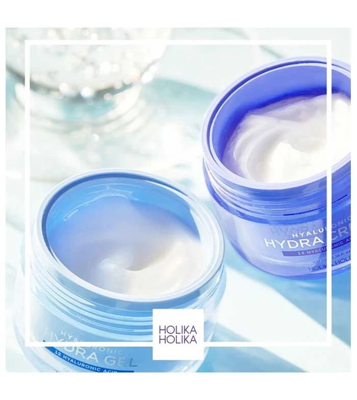 Une crème hydratante Hyaluronic Hydra Cream de Holika Holika à la texture douce et crémeuse, à haute teneur en acide hyaluronique.