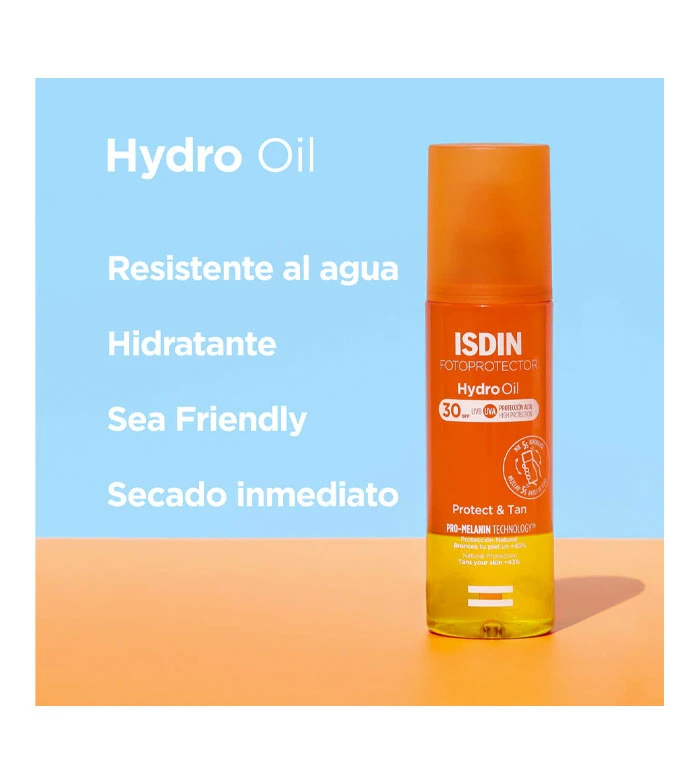 Le spray protecteur et bronzant ISDIN Hydro Oil SPF30 est un photoprotecteur corporel biphasique à haute protection SPF 30 UVB et UVA et doté de la technologie Pro-Mélanine, qui améliore le bronzage de la peau de 43%.