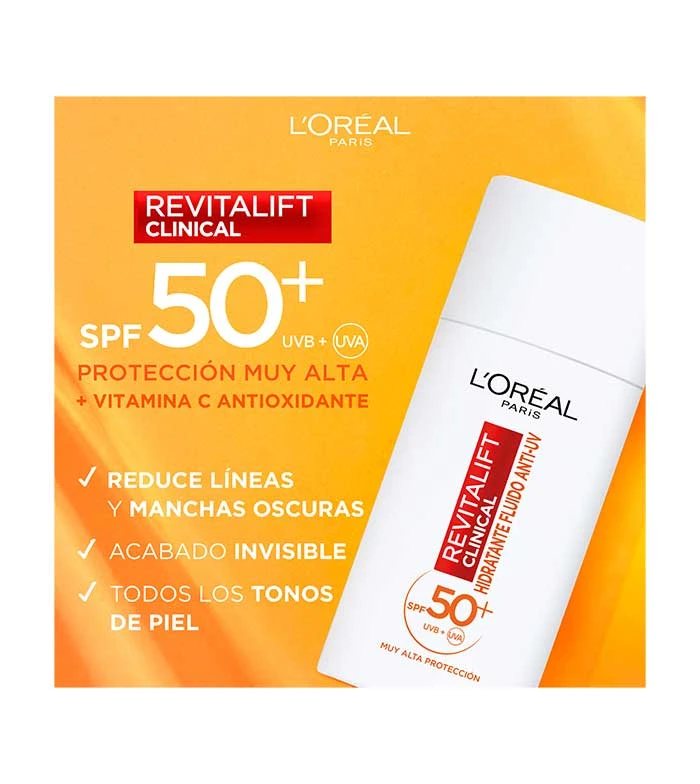 Fluide hydratant à la vitamine C anti-UV SPF 50+ Revitalift Clinical par Loreal Paris .