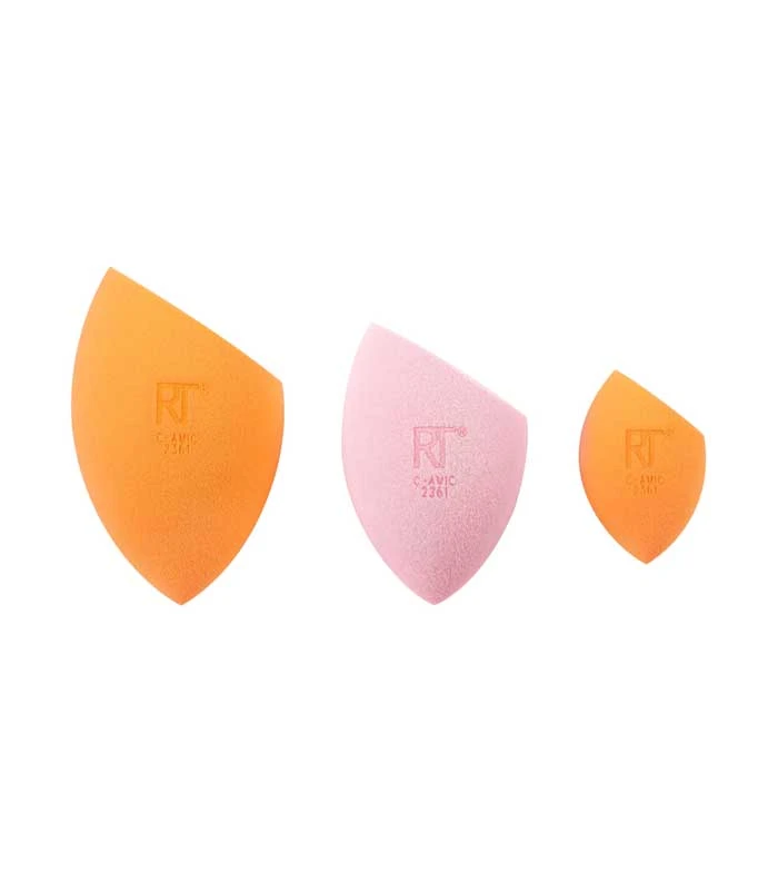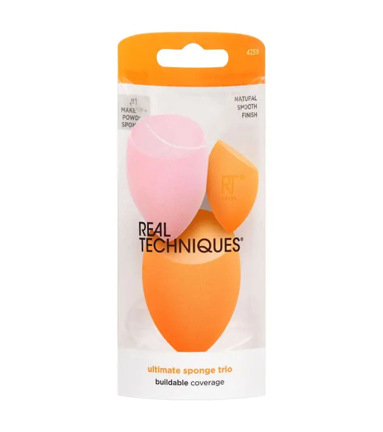 Ensemble de 3 éponges de maquillage Ultimate Sponge Trio de Real Techniques avec lesquelles vous obtiendrez un fini naturel, doux et modulable.