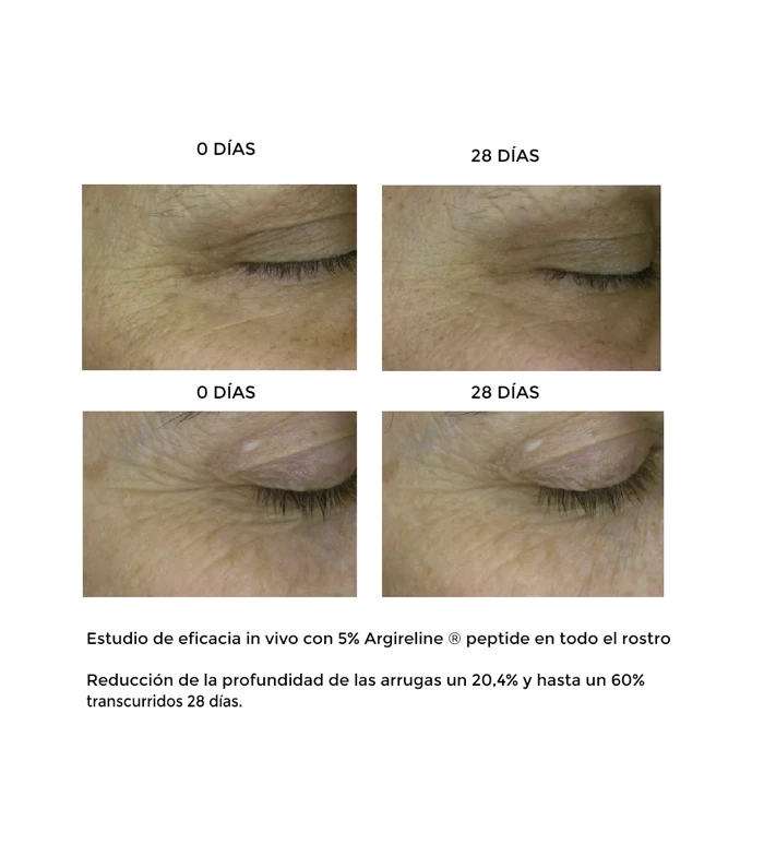 Peptide Argireline® 5% *. Contrairement au Botox, cet actif innovant, reconnu comme la première alternative topique aux traitements à base de toxine botulique, agit sur le même mécanisme en réduisant la contraction musculaire. De cette façon, il réduit efficacement la profondeur des rides. De plus, il stimule également la production de collagène, ce qui aide à maintenir une peau plus lisse. Réduction de la profondeur des rides de 20,4% et jusqu’à 60% après 28 jours. Etude d’efficacité in vivo avec 5% de peptide Argireline®.