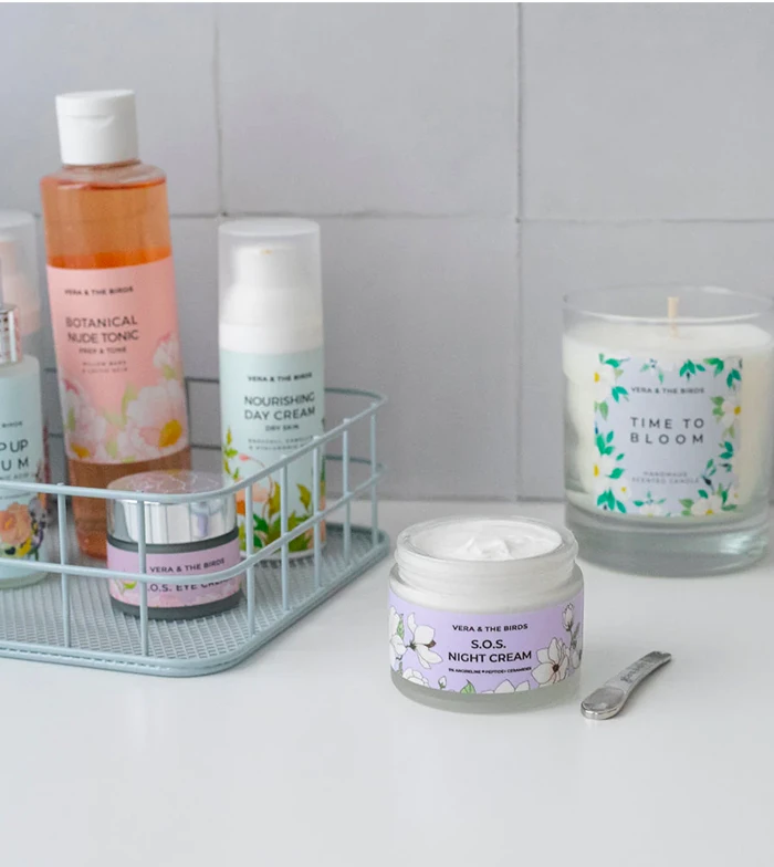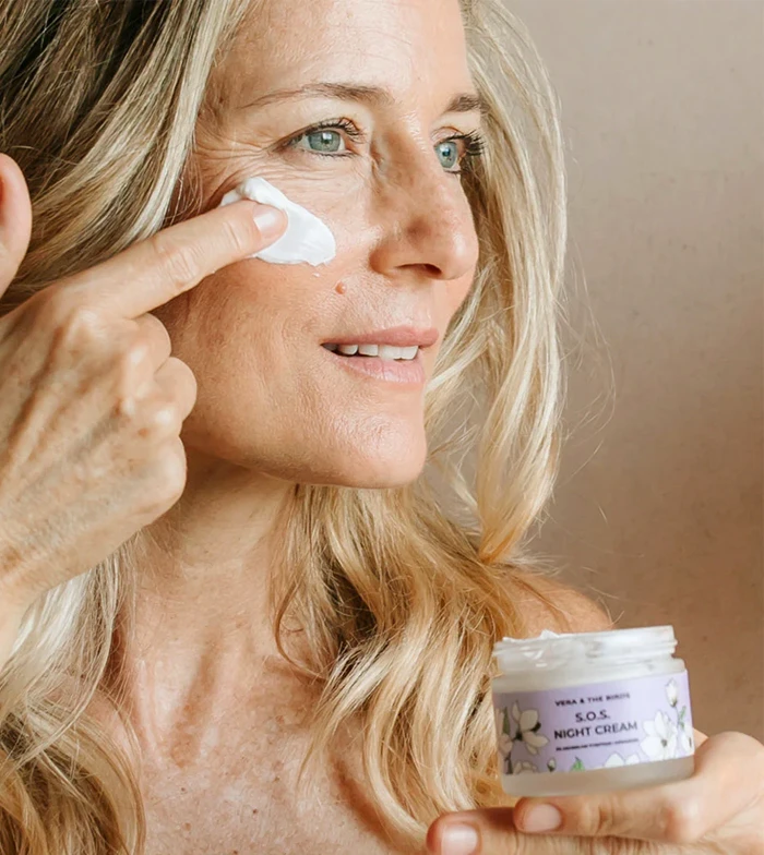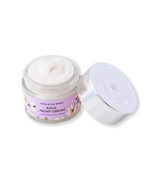 La crème de nuit Vera And The Birds SOS est formulée avec un puissant hexapeptide et des céramides pour aider à réduire les rides et ridules et retarder leur formation.