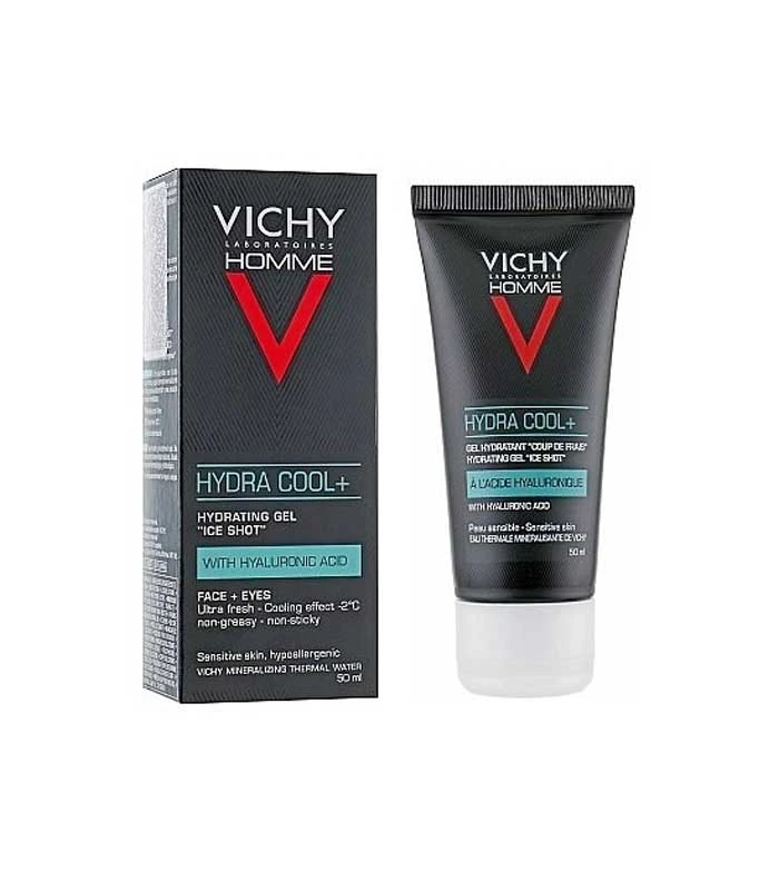Gel hydratant effet froid Vichy Homme Hydra Cool+ formulé à base d’acide hyaluronique, idéal pour la peau du visage et le contour des yeux.